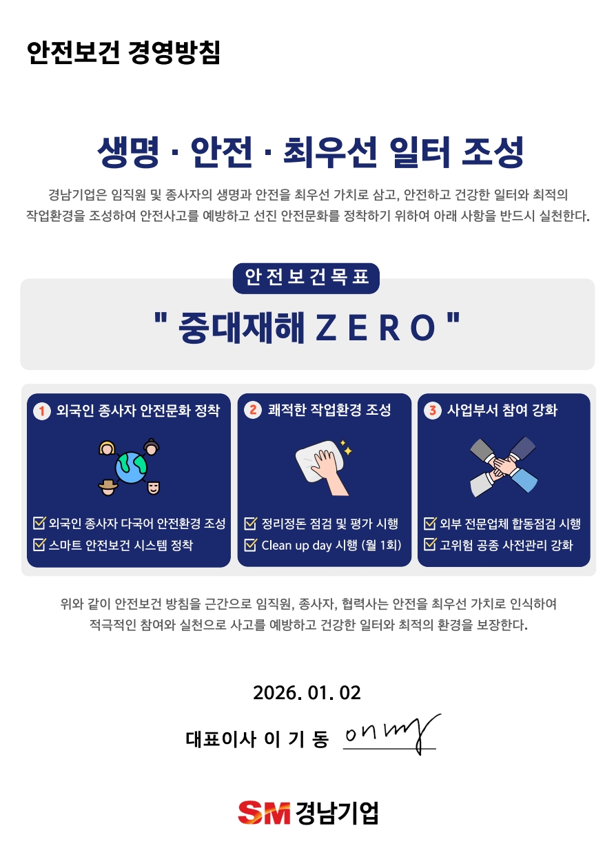 경남기업의 전 임직원 및 협력사는 『인명존중』의 핵심가치를 바탕으로 조직구성원의 능동적인 참여와 실천을 통해 안전하고 쾌적한 작업환경을 조성하고